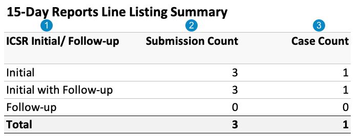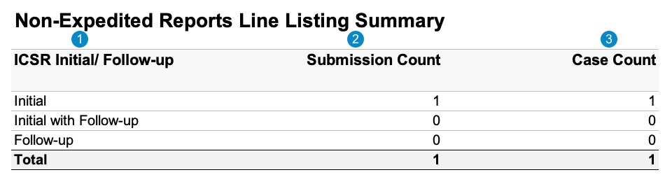| Non-Expedited Line Listing Summary | This report is a summary listing of non-expedited Cases and Submissions broken down by initial/follow-up. |
