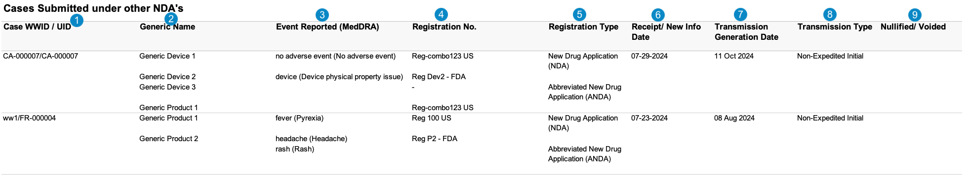 The Cases Submitted Under Other NDAs report is a Case line listing in which the drug or biological Product was listed as one (1) of the suspect Products on the Case, but the Case was submitted to the FDA under another New Drug Application (NDA), Abbreviated New Drug Application (ANDA), or Biologic License Application (BLA) held by the applicant.