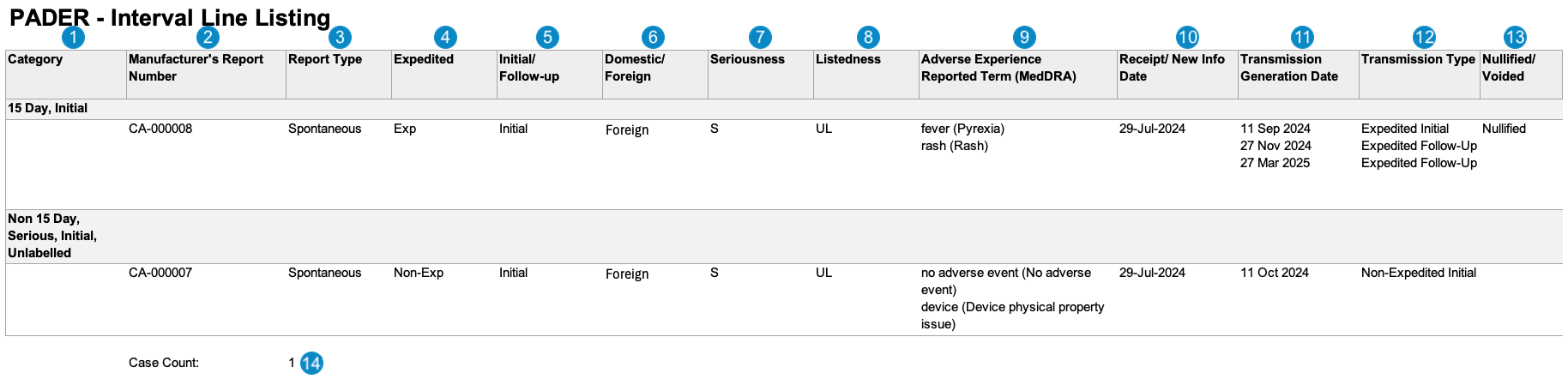 Case-Based Report: This report lists the Cases that match any of the report criteria in the PADER report set, sorted by Case Name.