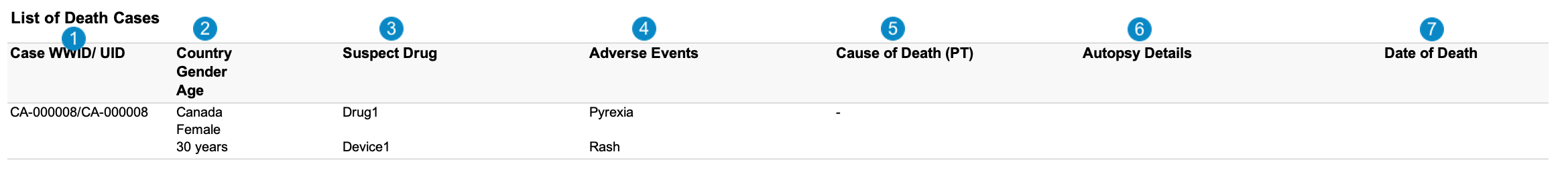 | List of Death Cases | This report lists all the Cases that were transmitted to the FDA during the reporting period as either a 15-day or a non-15-day report, where the patient has died. |
