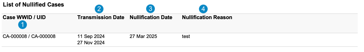 | List of Nullified Cases | This report is a listing of nullified Cases during the reporting interval. |