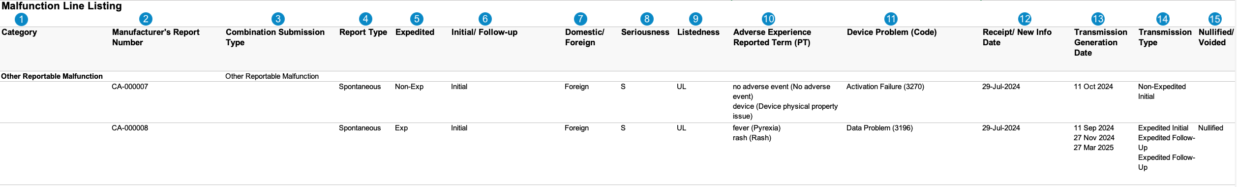 | Malfunction Line Listing | For Cases that contain combination products with a Device product type that has malfunctioned, this report prints a listing of device constituent malfunctions. |