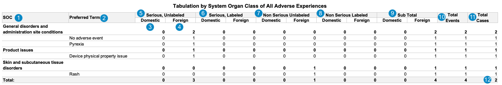 | Malfunction Tabulation | For Cases that contain combination products with a Device product type that has malfunctioned, this report prints the number of Case Adverse Events that match report criteria. |